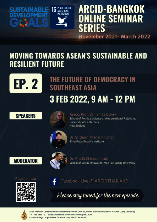 Asian Research Center for International Development (ARCID) School of Social Innovation Mae Fah Luang University invited to join ARCID-BKK Online seminar: The EP2 on The Future of Democracy in Southeast Asia to be held on 3 February 2022 from 9 am to 12 noon.