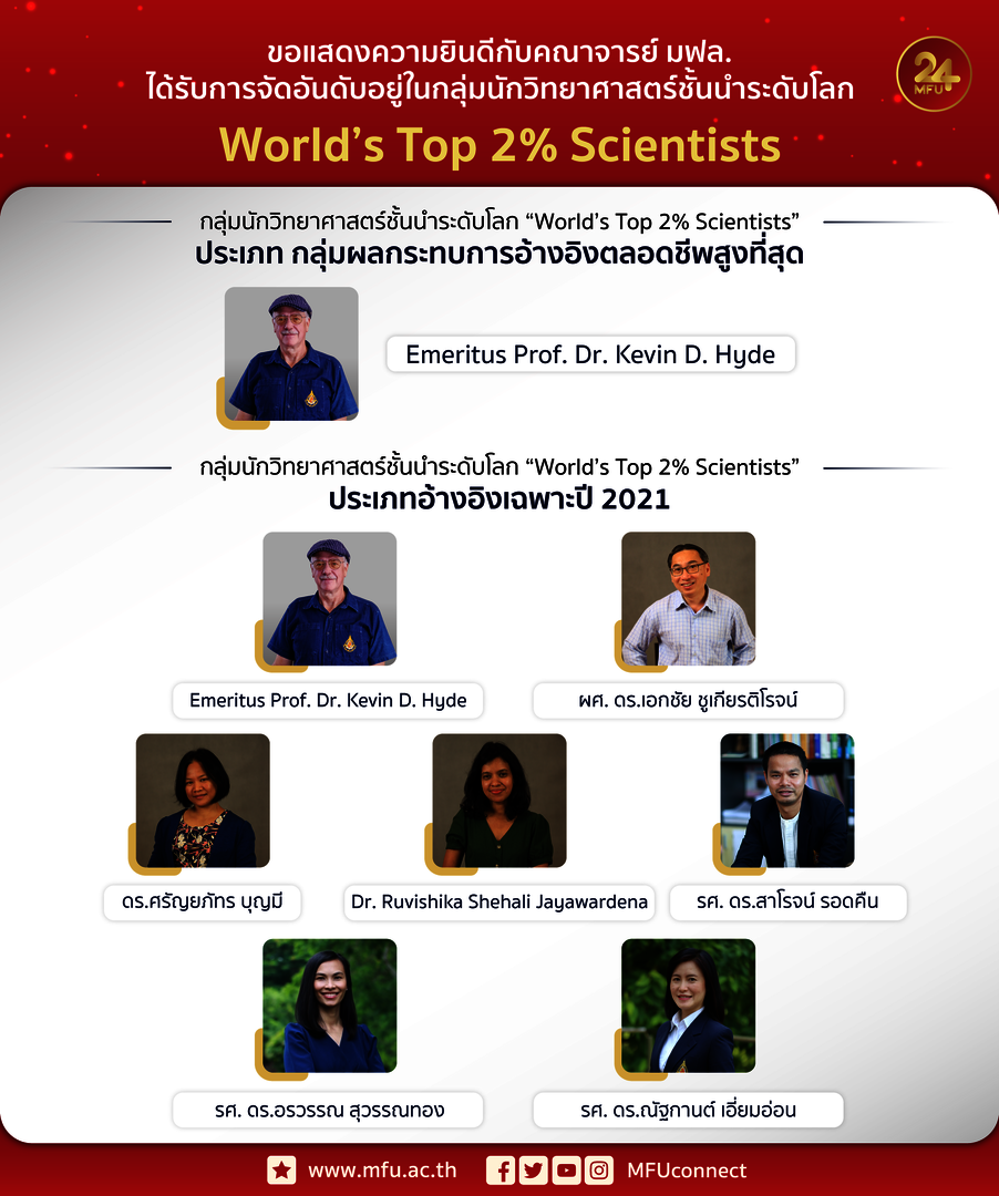 สำหรับ ผลการจัดอันดับประจำปี 2021 มีคณาจารย์ของมหาวิทยาลัยแม่ฟ้าหลวงติดอันดับจำนวน 7 ท่าน โดยในจำนวนนี้มีนักวิจัย 1 ท่านที่ติดอันดับทั้งจำแนกตามกลุ่มผลกระทบการอ้างอิงตลอดชีพสูงที่สุด และกลุ่มผลกระทบการอ้างอิงเฉพาะปี 2021 สูงที่สุด