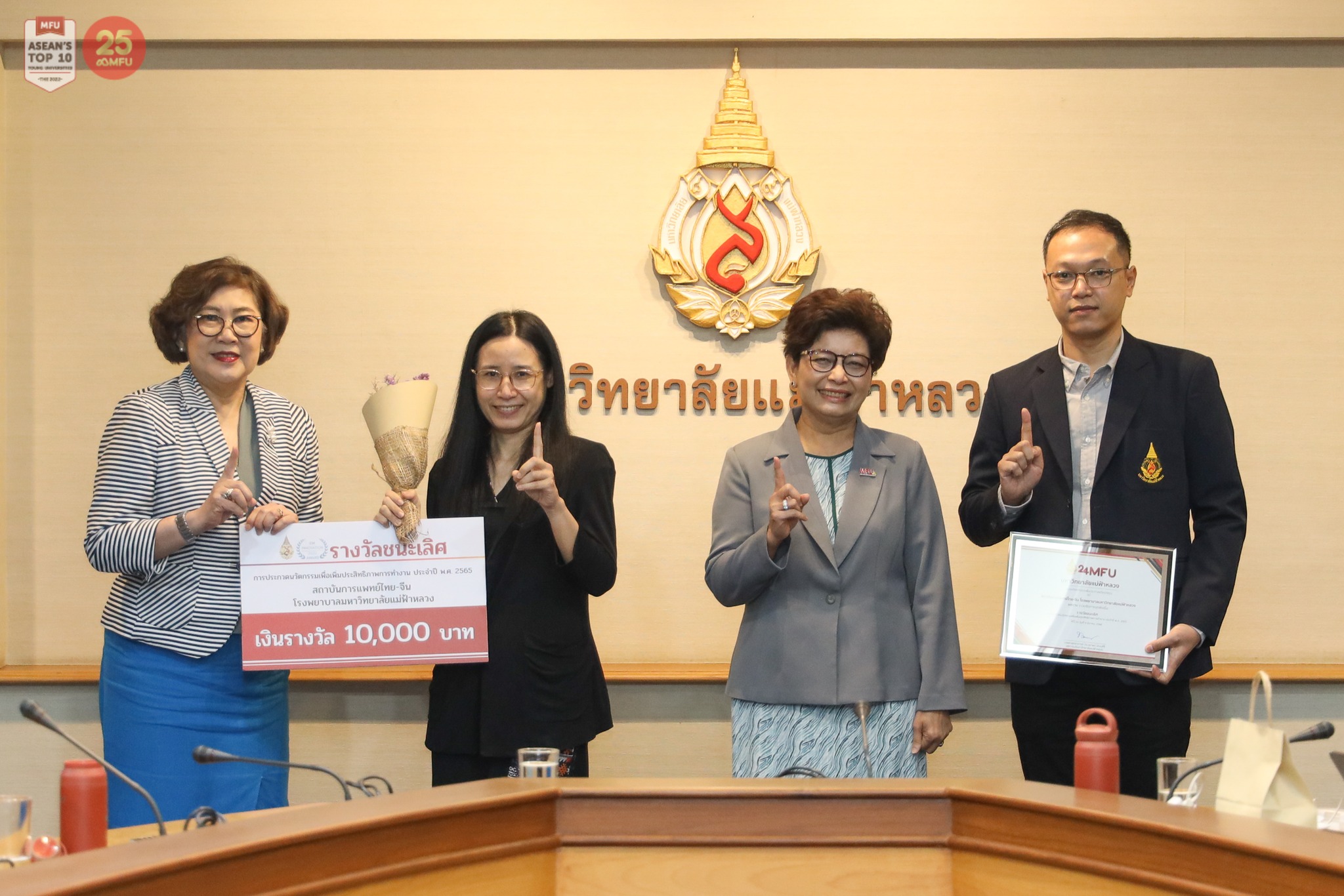 ในการนี้ รศ. ดร.ชยาพร วัฒนศิริ อธิการบดี ให้เกียรติมอบรางวัลพร้อมเกียรติบัตร รศ. ดร.นันทนา คชเสนี รองอธิการบดีฯ มอบป้ายเงินรางวัล ให้แก่ผู้ชนะ "การประกวดนวัตกรรมเพื่อเพิ่มประสิทธิภาพการทำงาน ประจำปี พ.ศ. 2565" จำนวน 6 ผลงาน ใน 3 ประเภท เมื่อวันที่ 9 มีนาคม 2566 ณ ห้องประชุมดอยตุง อาคารวันชัย ศิริชนะ (AD1) มหาวิทยาลัยแม่ฟ้าหลวง