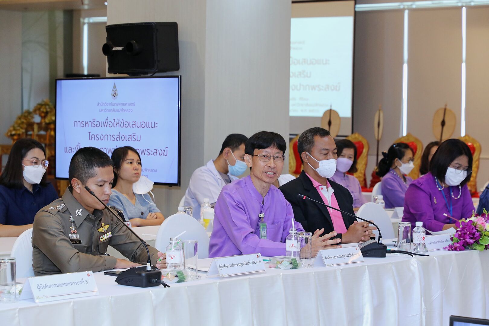 ต่อจากนั้น เป็นการประชุมหารือแนวทางการดำเนินงานและเปิดตัวโครงการส่งเสริมและฟื้นฟูสุขภาพช่องปากพระสงฆ์ ซึ่งดำเนินงานโดยโครงการทันตกรรมบรมราชชนนี สำนักวิชาทันตแพทย์ศาสตร์ มหาวิทยาลัยแม่ฟ้าหลวง ด้วยการสนับสนุนงบประมาณจาก มูลนิธิชัย โสภณพานิช โดย พระพุทธิญาณมุนี เจ้าคณะจังหวัดเชียงราย กล่าวอนุโมทนา ผู้ช่วยศาสตราจารย์ ดร.มัชฌิมา นราดิศร อธิการบดีมหาวิทยาลัยแม่ฟ้าหลวง เป็นประธานเปิดการประชุม นายสมหวัง บุญระยอง รองผู้ว่าราชการจังหวัดเชียงราย กล่าวสนับสนุนโครงการ ผศ. (พิเศษ) ทพ.ไพศาล กังวลกิจ คณบดีสำนักวิชาทันตแพทยศาสตร์ กล่าวรายงาน ในการนี้ได้มีการร่วมประชุมหารือและรับฟังข้อเสนอแนะ รวมถึงข้อสังเกตจากทุกภาคส่วน และคณะสงฆ์ เพื่อให้โครงการส่งเสริมและฟื้นฟูสุขภาพช่องปากพระสงฆ์และสามเณรสามารถดำเนินงานด้วยความราบรื่นและบรรลุผลสำเร็จตามเป้าหมายที่ได้วางไว้ ซึ่งต้องเกิดจากความร่วมไม้ร่วมมือจากทุกภาคส่วนภายในจังหวัดเชียงราย