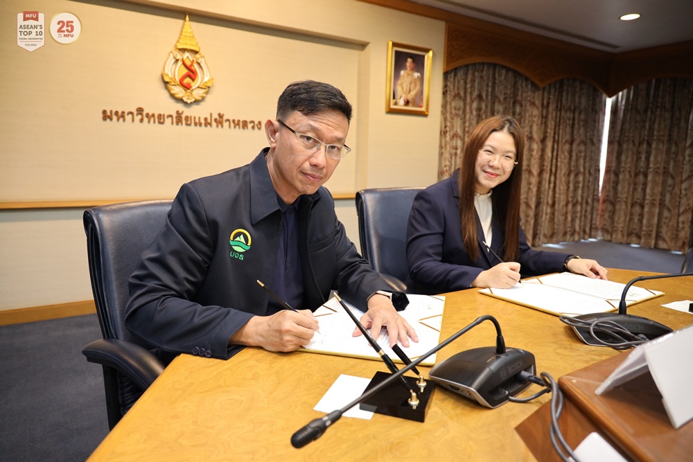 มหาวิทยาลัยแม่ฟ้าหลวง (มฟล.) โดยศูนย์นวัตกรรมสมุนไพรครบวงจร จัดพิธีบันทึกข้อตกลงความร่วมมือทางวิชาการ ระหว่างผู้ช่วยศาสตราจารย์ ดร.มัชฌิมา นราดิศร อธิการบดีมหาวิทยาลัยแม่ฟ้าหลวง และนายกุลพัชร ภูมิใจอวด ผู้อำนวยการสถาบันบริหารจัดการธนาคารที่ดิน (องค์การมหาชน) เพื่อส่งเสริมสนับสนุนกระบวนการที่เกี่ยวข้องกับการพัฒนาสายพันธุ์พืช การปลูก การแปรรูป การตลาด การรับรองมาตรฐานวัตถุดิบและการพัฒนาผลิตภัณฑ์สมุนไพรรวมทั้งเป็นการพัฒนาและเสริมสร้างความเข้มแข็งแก่เกษตรกรหรือองค์กรเกษตรกร เมื่อวันพฤหัสบดีที่ 17 สิงหาคม พ.ศ. 2566 เวลา 09.00 – 11.40 น. ณ ห้องประชุมดอยตุง อาคารวันชัย (AD1) มหาวิทยาลัยแม่ฟ้าหลวง โดยมีศาสตราจารย์ ดร.สุจิตรา วงศ์เกษมจิตต์ รองอธิการบดี ผู้ช่วยศาสตราจารย์ ดร.ระวิวรรณ์ เจริญทรัพย์ หัวหน้าศูนย์นวัตกรรมสมุนไพรครบวงจร นายเอก วรรณประทีป รองผู้อำนวยการสถาบันบริหารจัดการธนาคารที่ดิน ร่วมลงนามร่วม