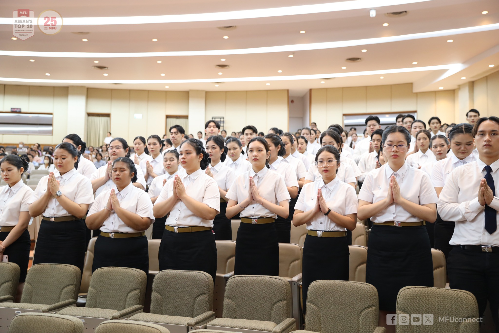 มหาวิทยาลัยแม่ฟ้าหลวง (มฟล.) โดย สำนักวิชาการแพทย์บูรณาการ จัดพิธียกขันตั้งไหว้สาคุณูปมาจารย์และพิธีมอบเสื้อกาวน์ ประจำปีการศึกษา 2566 เมื่อวันเสาร์ที่ 4 พฤศจิกายน 2566 ณ หอประชุมสมเด็จย่า ประกอบด้วยพิธีไหว้ครู พิธีปฏิญาณตน พิธีเจิมหนังสือ พิธีมอบเกียรติบัตร และพิธีมอบเสื้อกาวน์ให้แก่นักสึกษา 3 สาขาวิชา คือ สาขาวิชาการแพทย์แผนไทยประยุกต์ สาขาวิชากายภาพบำบัด และ สาขาวิชาการแพทย์แผนจีน โดย ผู้ช่วยศาสตราจารย์ ดร.มัชฌิมา นราดิศร อธิการบดี เข้าร่วมพิธีและกล่าวแสดงความยินดีแก่นักศึกษาที่รับมอบเสื้อกาวน์ อาจารย์ ดร.พญ.สุลัคณา น้อยประเสริฐ คณบดีสำนักวิชาการแพทย์บูรณาการ กล่าวรายงานและให้โอวาทแก่นักศึกษา ทั้งนี้ยังมีคณาจารย์ เจ้าหน้าที่ นักศึกษา และผู้ปกครอง ร่วมแสดงความยินดี หลังจากพิธีการในหอประชุมเสร็จสิ้น นักศึกษาร่วมพิธีถวายสัตย์ปฏิญาณตนต่อพระราชานุสาวรีย์สมเด็จพระศรีนครินทราบรมราชชนนี และถ่ายภาพร่วมกัน เป็นอันเสร็จสิ้นกิจกรรม