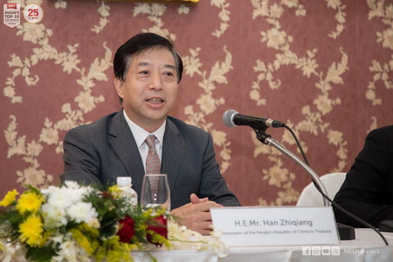 เอกอัครราชทูตหาน ได้กล่าวชื่นชมความสำเร็จด้านการเรียนการสอนภาษาจีนของ มฟล. ที่มีคุณภาพและเป็นที่ยอมรับอย่างแพร่หลาย ทั้งนี้ มฟล. และสถานเอกอัครราชทูตฯ มีความสัมพันธ์ระหว่างกันมาอย่างยาวนาน ได้ร่วมก่อตั้งศูนย์ภาษาและวัฒนธรรมจีนสิรินธร และสถาบันขงจื่อ มฟล. และมีการจัดกิจกรรมทางวิชาการและวัฒนธรรมร่วมกันอย่างต่อเนื่อง สถานเอกอัครราชทูตฯ สนับสนุนการแลกเปลี่ยนอาสาสมัครครูชาวจีนเพื่อมาสอนยังมหาวิทยาลัยฯ มาโดยตลอด