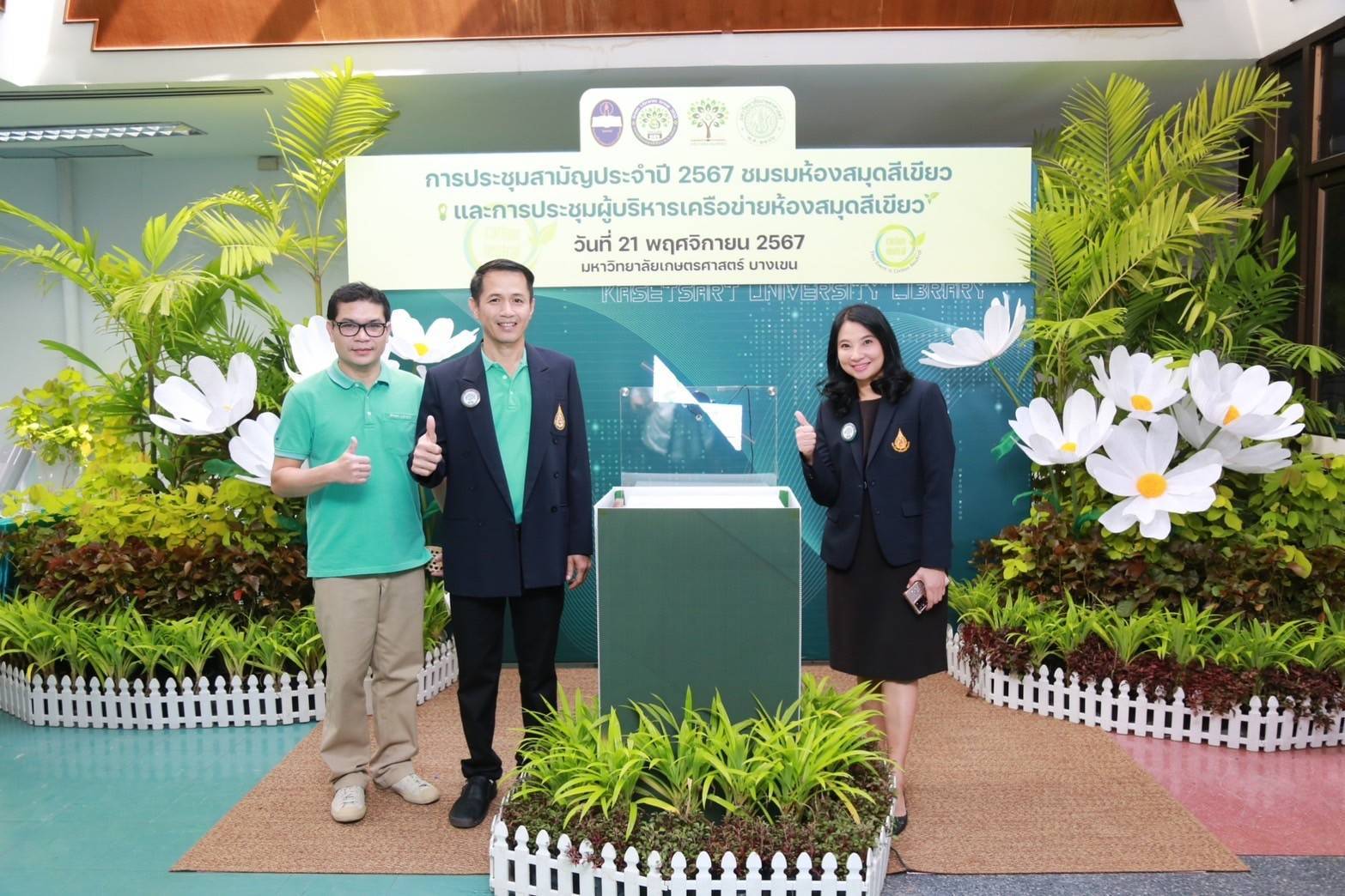เมื่อวันที่ 21 พฤศจิกายน 2567 ณ  ห้องประชุมกำพล อดุลวิทย์ อาคารสารนิเทศ 50 ปี มหาวิทยาลัยเกษตรศาสตร์ บางเขน คุณดาวนภา สุยะนนท์ ผู้อำนวยการศูนย์บรรณสารและสื่อการศึกษา คุณรุ่ง ผู้ค้าขาย ผู้ช่วยผู้อำนวยการศูนย์บรรณสารฯ และคุณดนัทธ์ ไชยสิทธิ์ บรรณารักษ์ เป็นผู้แทนของศูนย์บรรณสารฯ เข้ารับโล่ประกาศเกียรติคุณ “ห้องสมุดสีเขียว” ประจำปี 2567 จากสมาคมห้องสมุดแห่งประเทศไทย ในพระราชูปถัมภ์สมเด็จพระเทพรัตนราชสุดาฯ สยามบรมราชกุมารี (ชมรมห้องสมุดสีเขียว) ทั้งนี้ ศูนย์บรรณสารฯ เป็น 1 ใน 5 ห้องสมุดนำร่องที่ผ่านการรับรองการตรวจประเมินห้องสมุดสีเขียว (ฉบับปรับปรุงใหม่) ซึ่งได้รวมเกณฑ์การประเมินด้านห้องสมุด 35 ตัวชี้วัด และเกณฑ์การประเมินทรัพยากรและสิ่งแวดล้อม ของกรมการเปลี่ยนแปลงสภาพภูมิอากาศและสิ่งแวดล้อม กระทรวงทรัพยากรธรรมชาติและสิ่งแวดล้อม 63 ตัวชี้วัด ทั้งนี้ มีห้องสมุดที่ได้รับโล่ประกาศเกียรติคุณ “ห้องสมุดสีเขียว” ที่ผ่านการตรวจประเมินประจำปี 2567 จำนวน 5 แห่ง ได้แก่