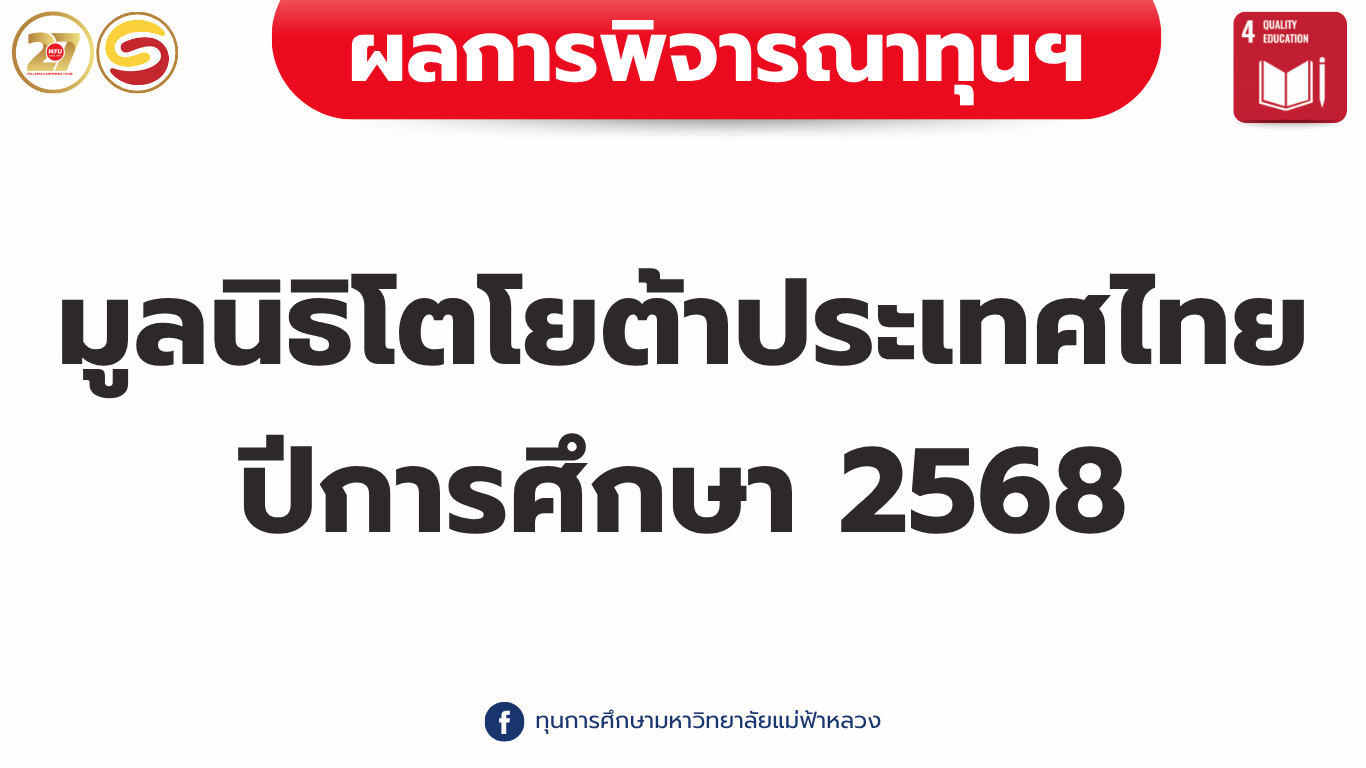 ประกาศรายชื่อผู้ได้รับทุนการศึกษามูลนิธิโตโยต้าประเทศไทย มหาวิทยาลัยแม่ฟ้าหลวง ประจำปีการศึกษา 2568 ระดับอุดมศึกษา