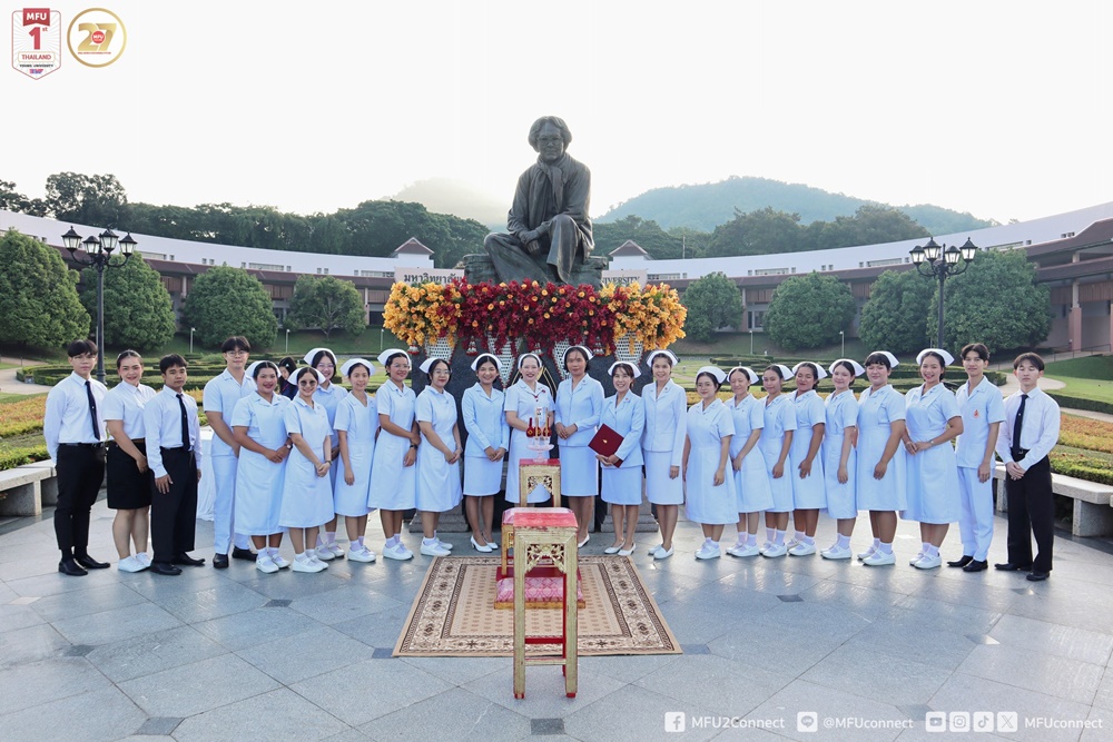วันอังคารที่ 21 ตุลาคม 2568 สำนักวิชาพยาบาลศาสตร์ ร่วมกับ สำนักวิชาทันตแพทยศาสตร์ มหาวิทยาลัยแม่ฟ้าหลวง จัดพิธีถวายเครื่องสักการะแด่สมเด็จพระศรีนครินทราบรมราชชนนี เนื่องในวันพยาบาลแห่งชาติและวันทันตสาธารณสุขแห่งชาติ ณ ลานพระราชานุสาวรีย์สมเด็จพระศรีนครินทราบรมราชชนนี โดยมี ผศ. ดร.มัชฌิมา นราดิศร อธิการบดีมหาวิทยาลัยแม่ฟ้าหลวง เป็นประธานในพิธี พร้อมด้วย ผศ. ดร.ชมพูนุช โสภาจารีย์ คณบดีสำนักวิชาพยาบาลศาสตร์ อาจารย์ ดร.ทันตแพทย์ณรงค์ ลุมพิกานนท์ คณบดีสำนักวิชาทันตแพทยศาสตร์ ผู้บริหาร คณาจารย์ บุคลากร และนักศึกษามาร่วมพิธีอย่างพร้อมเพรียง เพื่อแสดงความจงรักภักดีและสำนึกในพระมหากรุณาธิคุณของพระองค์ที่ทรงอุทิศพระวรกายในการพัฒนาด้านสาธารณสุขของประเทศอย่างต่อเนื่อง