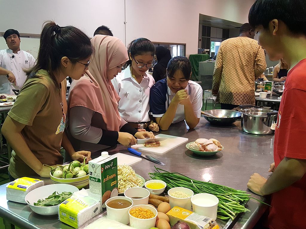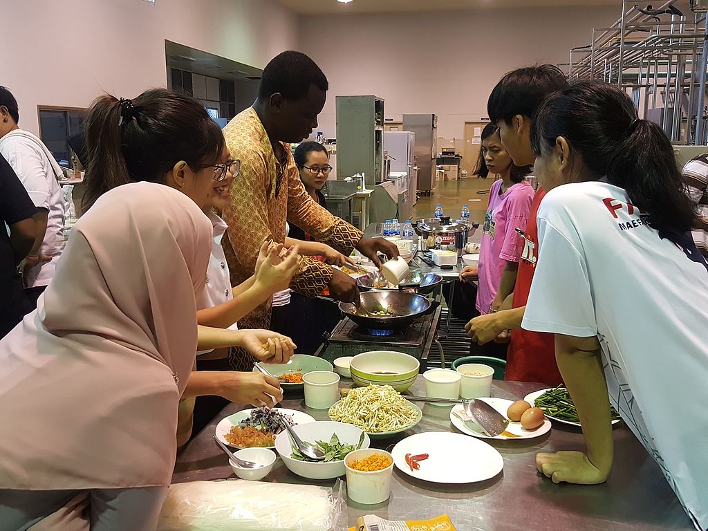 มหาวิทยาลัยแม่ฟ้าหลวง (มฟล.) โดย ส่วนพัฒนาความสัมพันธ์ระหว่างประเทศ จัดกิจกรรมทำอาหารไทย (Cooking with Friends) โดยมีนักศึกษาจากชาติต่างๆ เข้าร่วม เมื่อวันเสาร์ที่ 21 ตุลาคม 2560 ณ ห้อง 102 อาคารปฏิบัติการวิทยาศาสตร์และเทคโนโลยี 4 และมีเชฟเบน ภัทรพล เกิดกังวาฬ นักศึกษาเก่าจากสาขาวิชาการจัดการอุตสาหกรรมการบริการ สำนักวิชาการจัดการ มาเป็นวิทยากรสอนทำอาหารและขนมหวานของไทย ในส่วนอาหารคาวนั้นเป็นเมนูขึ้นชื่อของไทยอย่างผัดไทยและแกงเขียวหวานไก่ ขาดไม่ได้คือเมนูของหวานนั้นเป็นบัวลอยกับลูกชุบ นอกจากจะได้รับความสนุกสนานในการลงมือทำอาหารด้วยตนเองแล้ว นักศึกษานานาชาติยังได้เรียนรู้วัฒนธรรมการกินอันมีความหลากหลายของไทย ทั้งยังส่งเสริมให้เกิดความสัมพันธ์อันดีระหว่างนักศึกษาชาติต่างๆ ที่ใช้ชีวิตอยู่ในรั้วมหาวิทยาลัยแห่งนี้ และแสดงให้เห็นความใส่ใจของมหาวิทยาลัยต่อนักศึกษา ทั้งชาวไทยและชาวต่างชาติ