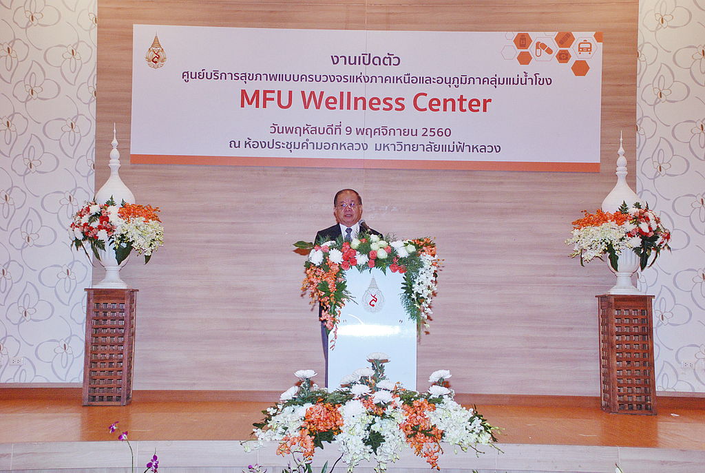 อธิการบดี มฟล. กล่าวในฐานะประธานในพิธีเปิดตัวโครงการ MFU Wellness Center ซึ่งปัจจุบันอยู่ระหว่างการก่อสร้างอาคารอยู่ภายในศูนย์การแพทย์ มฟล.ใกล้อาคารรวมของ มฟล.พื้นที่ ต.ท่าสุด อ.เมือง จ.เชียงราย มีกำหนดก่อสร้างตั้งแต่ปี 2561-2563 นี้ โดยพิธีมีนายภาสกร บุญญลักษณ์ รองผู้ว่าราชการ จ.เชียงราย ภาครัฐและเอกชนที่เกี่ยวข้องเข้าร่วมประมาณ 200 คน และทาง มฟล.ได้แจ้งถึงความเป็นมา ความคืบหน้า กิจกรรมที่เกี่ยวข้องกับศูนย์ดังกล่าวเพื่อให้สังคมได้รับทราบ